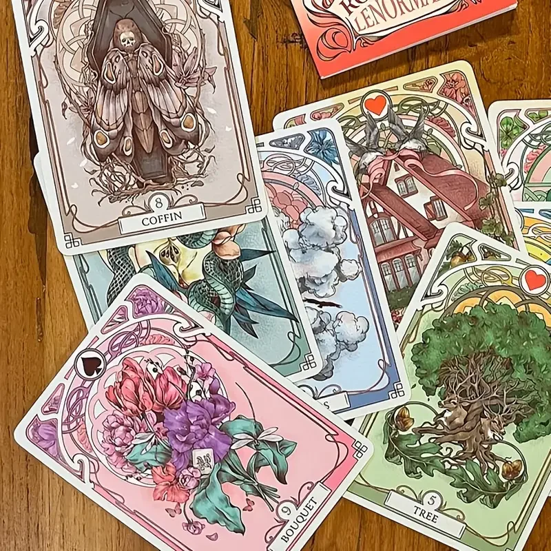 Εντυπωσιακό σετ Lenormand με ρομαντική, καλλιτεχνική αισθητική, ιδανικό για αναγνώσεις που εστιάζουν σε θέματα σχέσεων, συναισθημάτων και προσωπικής σύνδεσης. Οι κάρτες διαθέτουν καθαρά σύμβολα και ήπια, ρομαντικά χρώματα που ενισχύουν τη διαίσθηση και τη συναισθηματική εμβάθυνση.