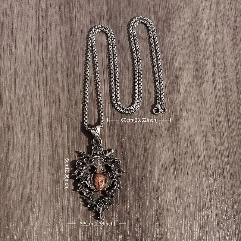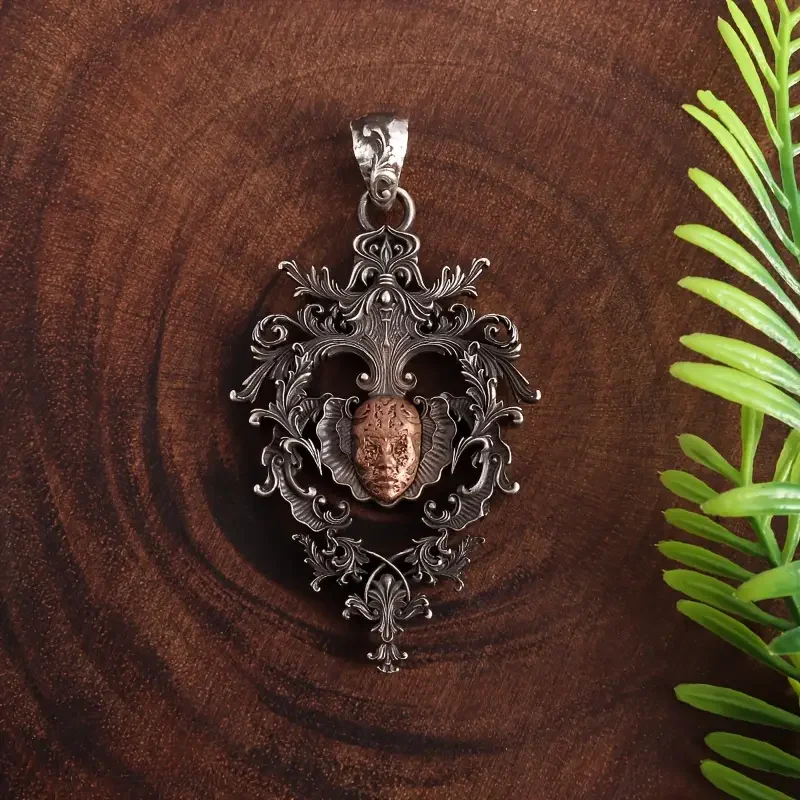 Εντυπωσιακό γοτθικό μεταγιόν με ανάγλυφη ιερή μάσκα στο κέντρο, σύμβολο προστασίας, εσωτερικής σοφίας και μυστικιστικής δύναμης.
